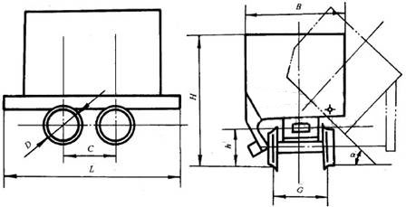 注: 1.高度H和牽引高h,自軌面算起(空載時)。 2.裝載量按物料松散密度ρ=2500 kg/m3計算。 | |||||||||||