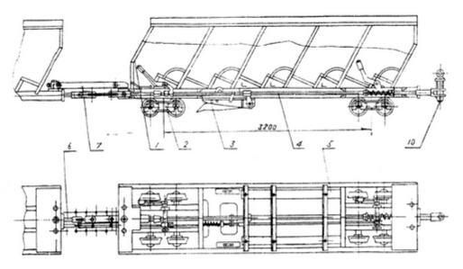 整個列車由兩節(jié)頭車及一定數(shù)量的掛車和尾車用三環(huán)鏈串連組列而成。由提升機(jī)牽引列車之首的S1頭車運(yùn)行。每節(jié)頭車上設(shè)有開動裝置,帶有一個輪對的制動裝置、緩沖裝置,帶有一個輪對的滑動棚架、閉鎖裝置等。兩節(jié)頭車的主拉桿用Φ18×64的7節(jié)環(huán)形鏈連接起來,從而使兩個結(jié)構(gòu)獨(dú)立的開動裝置的撞塊能同時打開獨(dú)立安在兩臺頭車上的制動裝置達(dá)到同步抓捕。四對抱爪同時定點(diǎn)抓住鋼軌后,掛車連同頭車滑動棚架一同因緩沖器迅速吸收了運(yùn)動能量而減速下滑,頭車滑動棚架下的輪對與制動架下邊的輪對,兩軸拉開的距離就是緩沖距離,最大達(dá)1.4米。